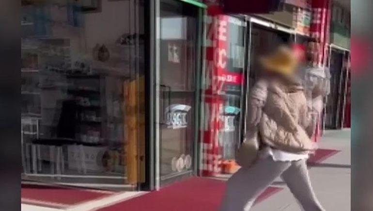 Görüntülerde, kadının kapısı açık iş yerine dışarıdan taşı fırlatması, o esnada içeride kucağında bebeği bulunan eczacı ile çalışanların kaçışması ve taşın tezgahtaki bazı ürünleri devirmesi yer alıyor.