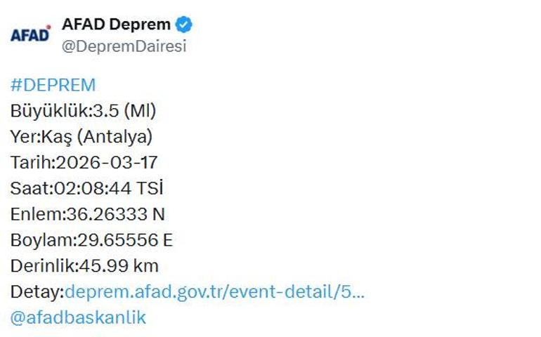 AFAD’ın internet sitesinde yer alan bilgilere göre; Antalya’nın Kaş ilçesi 3.5 büyüklüğünde depremle sarsıldı. Gece saat 02.08’de meydana gelen sarsıntının derinliği 45 kilometre olarak ölçüldü.