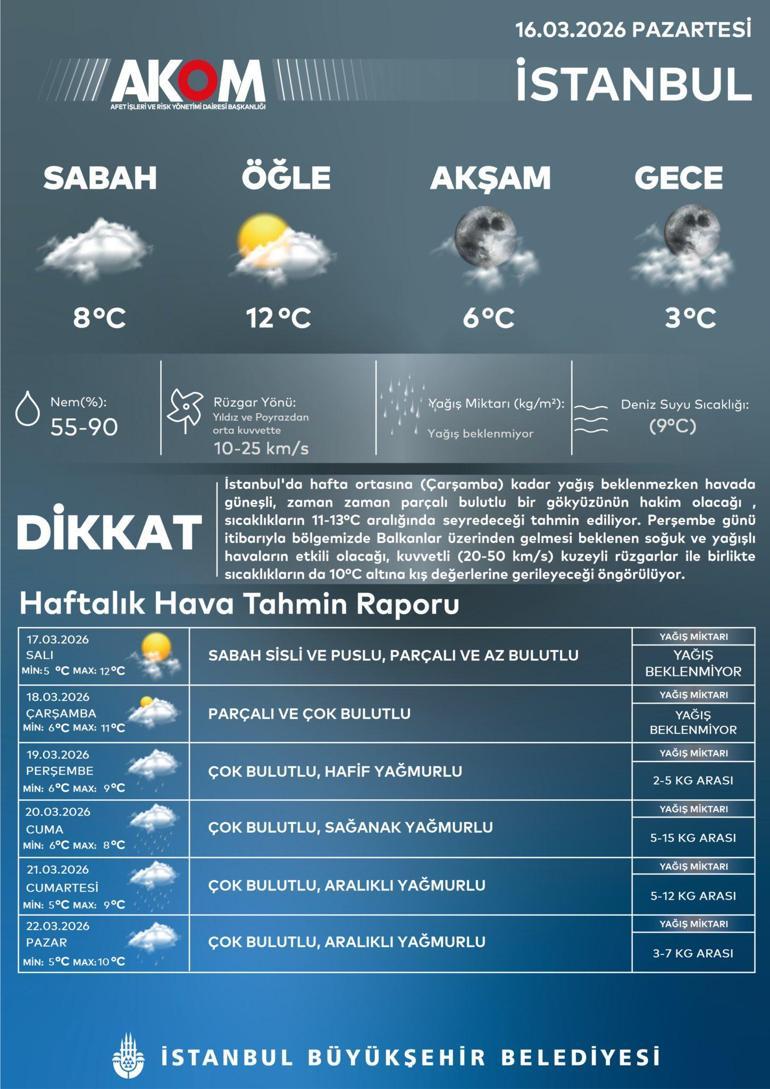 Açıklamada; “İstanbul’da hafta ortasına (çarşamba) kadar yağış beklenmezken havada güneşli, zaman zaman parçalı bulutlu bir gökyüzünün hakim olacağı, sıcaklıkların 11-13 derece aralığında seyredeceği öngörülüyor” ifadeleri kullanıldı.